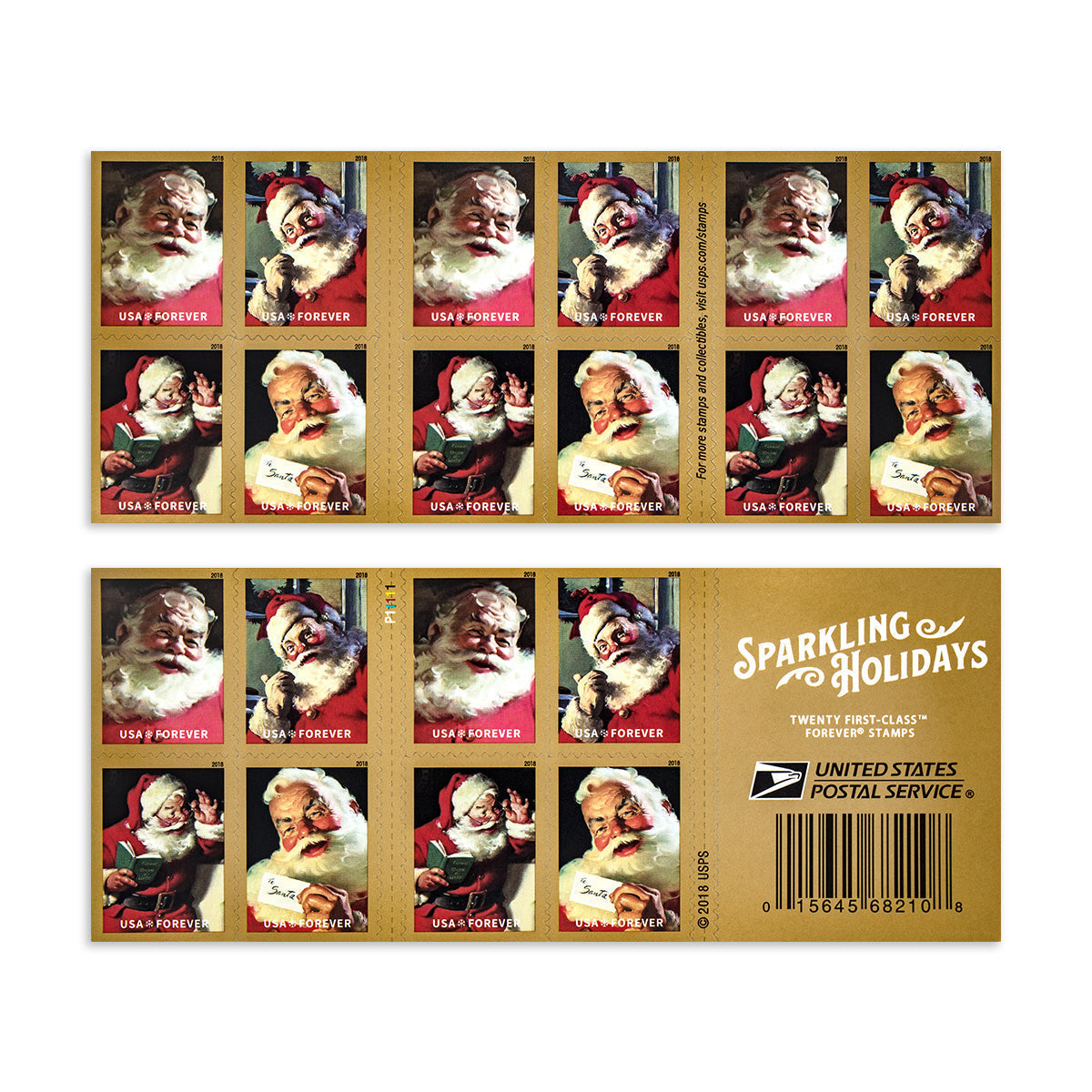 The Sparkling Holidays stamps. sold in booklets of 20. feature four classic portraits of Santa Claus. Taken from larger paintings created by Sundblom. these vintage images were originally published in ads for The Coca-Cola Company from the 1940s through the early 1960s. Sundblom is credited as the individual who most refined the modern image of Santa.